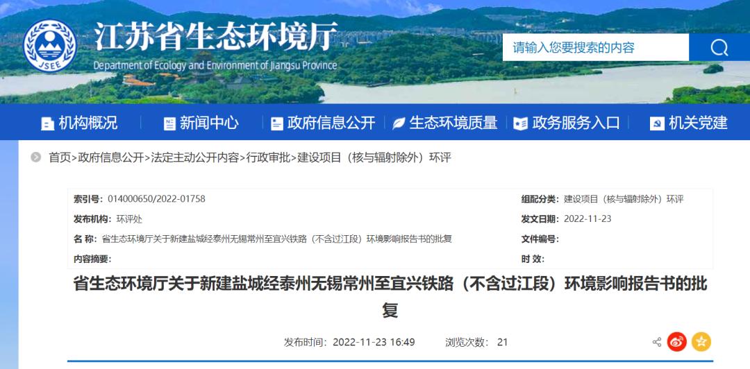 该项目符合《中长期铁路网规划》、《江苏省“十四五”铁路发展暨中长期路网布局规划》和《江苏省沿江城市群城际铁路建设规划(2019—2025年)》。项目占用(穿越)通榆河伍佑水源地饮用水水源保护区生态保护红线,已取得江苏省人民政府出具的不可避让生态保护红线意见的函;项目占用(穿越)通榆河(亭湖区)清水通道维护区、兴化市西北湖荡重要湿地等25处生态空间管控区域,已取得所在地设区市人民政府出具的不可避让生态空间管控区域意见的函;项目涉及种质资源保护区、风景名胜区、文物保护单位等区域,总体符合相关管理规定或主管部门已出具意见。项目选址选线已通过省自然资源厅选址选线论证,并取得了用地预审与选址意见。项目实施可能对沿线生态、声环境、水环境、大气环境等造成不利影响,在全面落实《报告书》及本批复提出的各项生态环境保护和污染防治措施的前提下,项目建设的不利生态环境影响可以得到一定减缓和控制。我厅原则同意《报告书》的环境影响评价总体结论和各项生态环境保护措施。