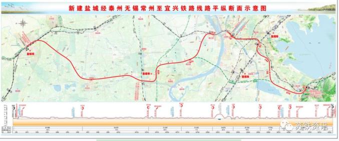 一、该项目位于江苏境内,包括正线及相关工程。正线起自徐宿淮盐铁路盐城站,总体向南经泰州市、扬州市、无锡市,中间穿越常州市,接入宜兴站。正线全长296.9公里(不含14.5公里过江段),按高速铁路标准建设,为双线电气化客运专线,设计速度为350公里/小时(其中靖江东至太湖西段250公里/小时)。正线设车站11座,其中,新建9座,利用既有2座。