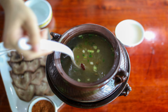顾客在洛桑益西的餐馆里从塔巴陶器罐子里盛汤(7月11日摄)。新华社记者 姜帆 摄