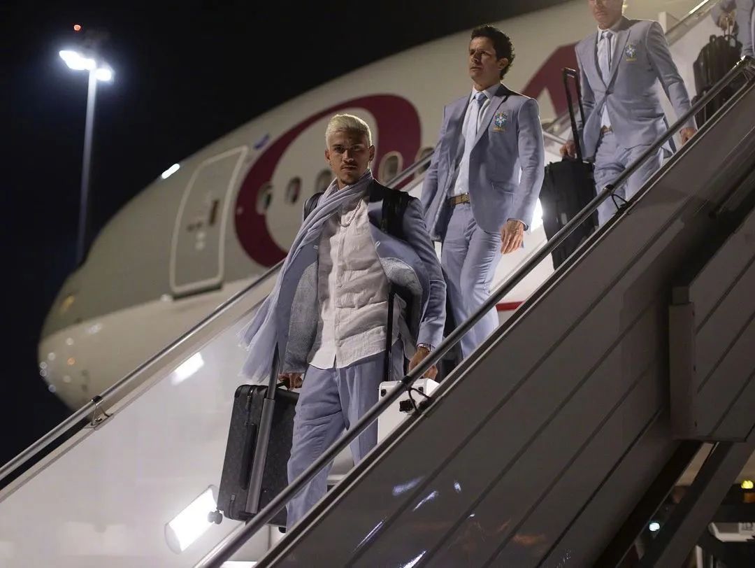 巴西队在一水的深色服装中选择了灰蓝色西装,令人眼前一亮。