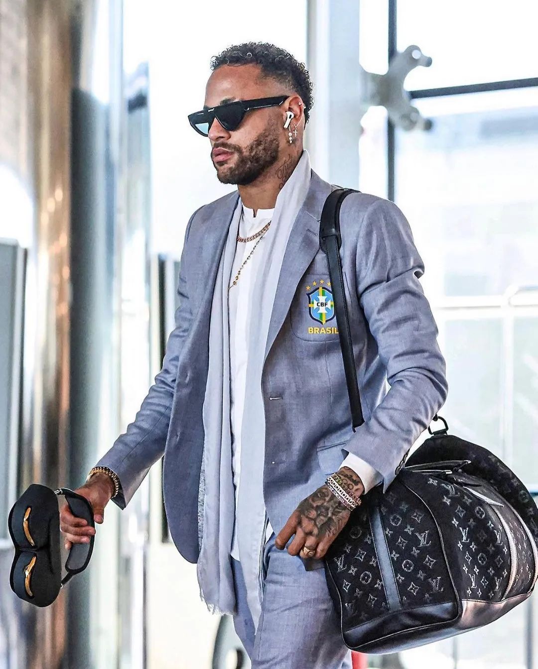 内马尔更是配上了墨镜、大金链子、大金表和LV旅行包,时尚度拉满。