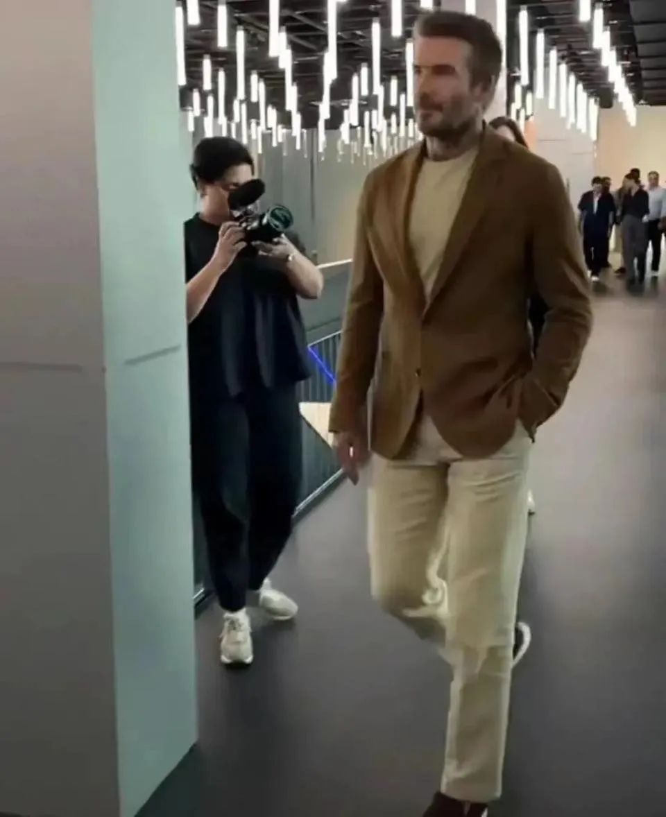 现场视频虽然糊到包浆,但还是能感觉到西装的质感很好。修身的剪裁,尽显小贝的好身材。而且在和小王子互动玩球时,衣服也不走形。