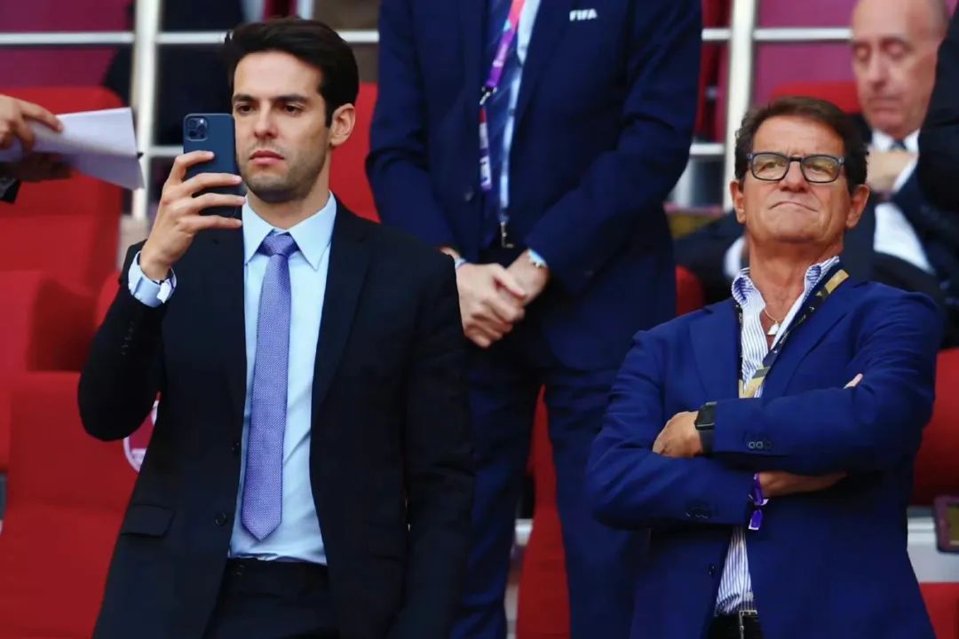同样是这场比赛中,巴西的前金球奖得主卡卡也现身看台,颜值依然在线,身旁是名帅卡佩罗。