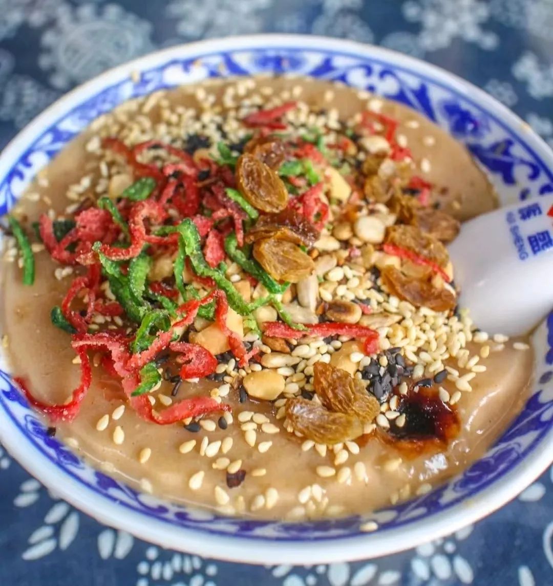 济南的茶汤比山东其他地区的更为讲究,在巷尾街头找一处茶汤铺子坐下,用甘甜清冽的泉水冲一碗茶汤,再在其中撒入白糖、红糖、黑芝麻、白芝麻、花生、瓜子、青红丝、葡萄干八样小料。