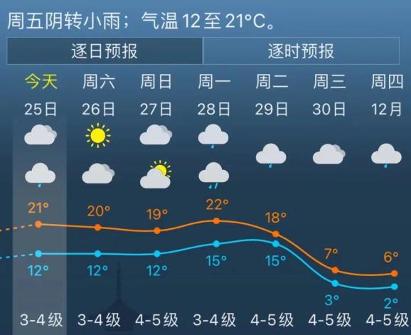 最高温度21℃,最低温度12℃。