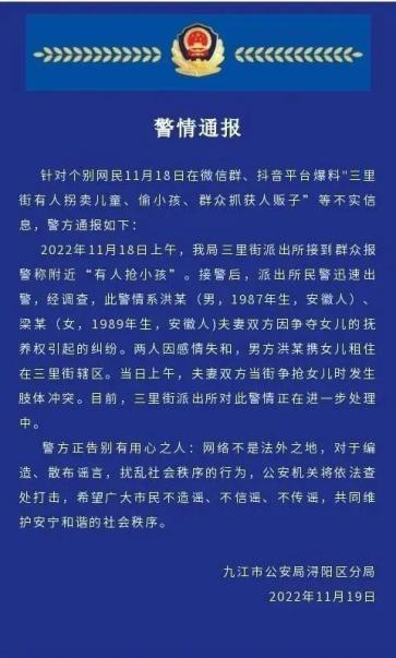 据“九江网警巡查执法”微信公众号消息,针对个别网民11月18日爆料“三里街有人拐卖儿童、偷小孩、群众抓获人贩子”等不实信息,江西九江警方通报称,经调查,此警情系洪某(男,1987年生,安徽人)、梁某(女,1989年生,安徽人)夫妻双方因争夺女儿的抚养权引起的纠纷。两人因感情失和,男方洪某携女儿租住在三里街辖区。当日上午,夫妻双方当街争抢女儿时发生肢体冲突。