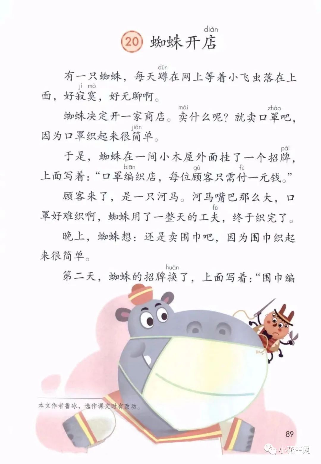 比如二年级下册的《蜘蛛开店》里的蜘蛛开了间编织店,但因为不会定价,累得自己没法继续开店。原文在第三位顾客蜈蚣到来时就以蜘蛛逃跑而告终。