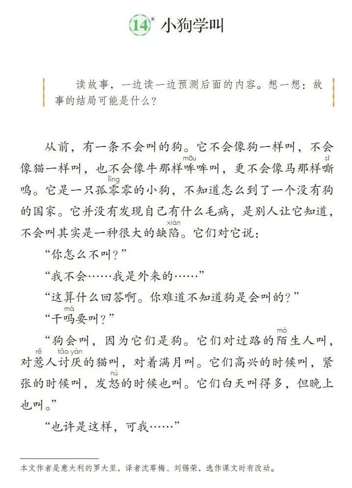 三年级上册的《小狗学叫》这篇课文讲了一只不会叫的狗跟先后跟小公鸡、杜鹃等动物学叫,闹出不少乌龙。