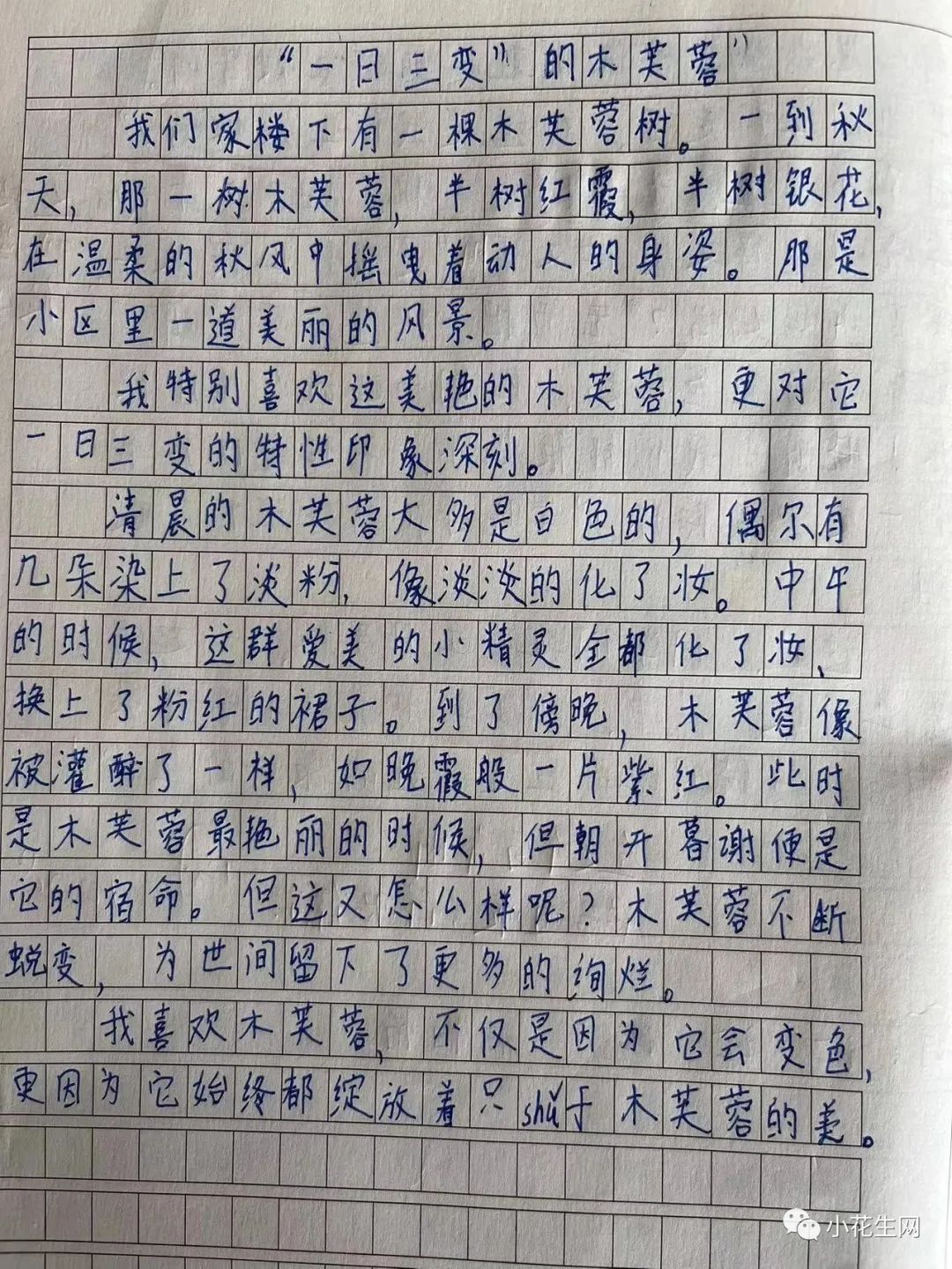 下面这篇《一日三变的木芙蓉》就是她根据之前搜集的木芙蓉资料,加上自己观察所得写的随堂习作。