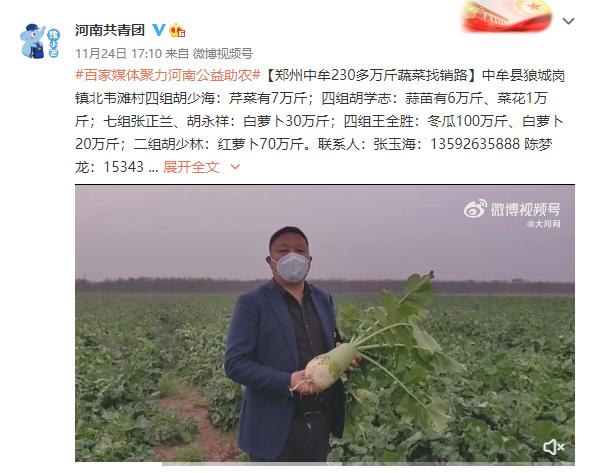 共青团南阳市委11月24日,团南阳市委积极对接社会资源,调动各方力量,第一时间组织协调人员赶赴邓州市白牛镇实地查看情况,帮助菜农采摘蔬菜,并通过线上直播等方式带货助销。团市委、市青联、市青企协成员、青年志愿者们奔赴田间地头,他们纷纷表示,眼下正值农忙时节,做这些力所能及的工作,也是在帮人民群众解决实际困难。此次共采收白菜20万斤,萝卜6万斤,包菜4万斤,生菜2万斤,切实帮助菜农解决了急难愁盼。此次行动在帮助菜农解决蔬菜滞销难题的同时,也充分展现了团组织主动担当、积极作为、为民解忧的青春力量。