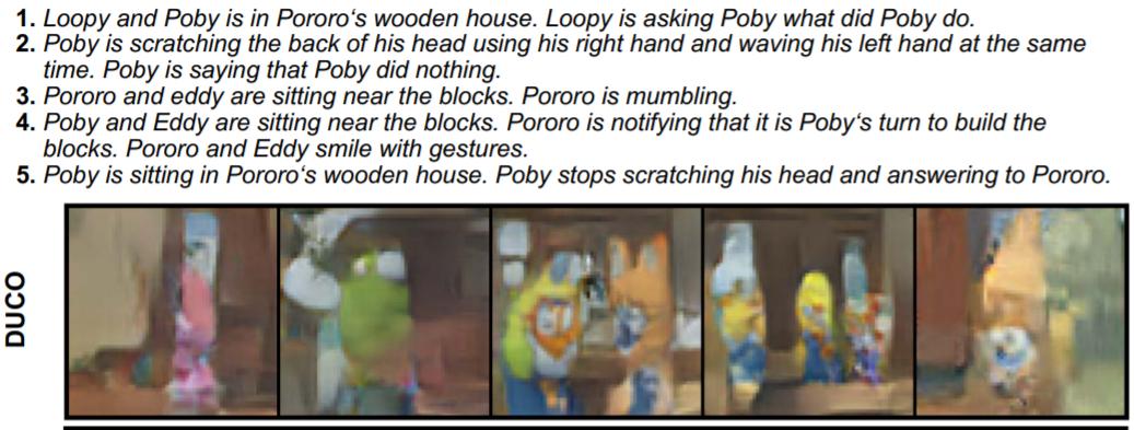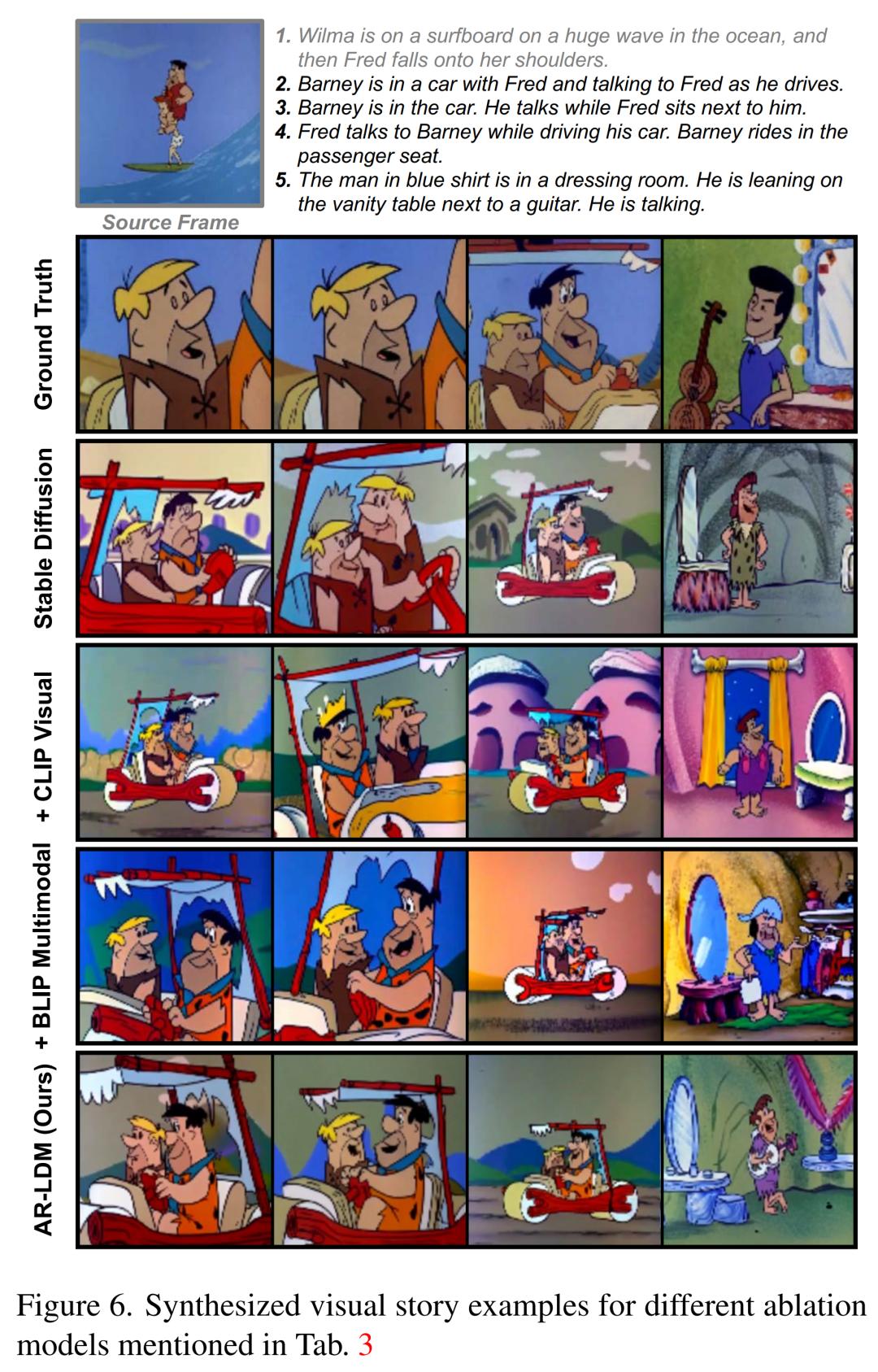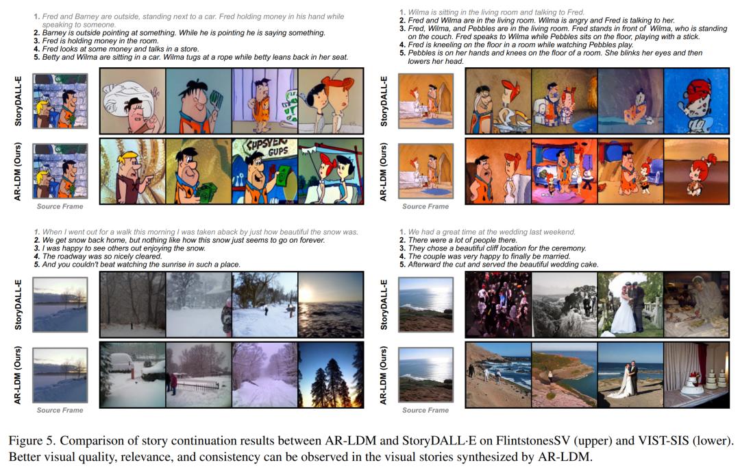 下图 5 显示了 FlintstonesSV 和 VIST-SIS 数据集上的更多示例,可以观察到跨帧的场景一致性,例如左上角示例中第三帧和第四帧的窗户,左下角示例中的海岸场景。
