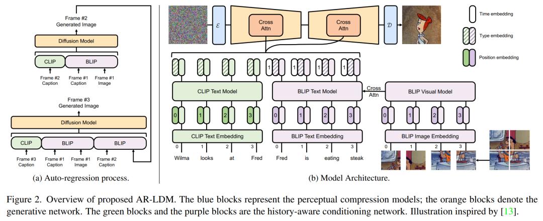 设计强大的故事合成模型的关键是使其能够将当前图像生成与历史字幕和场景结合起来。在这项工作中,研究者提出了 AR-LDM,以实现更好的跨帧一致性。如下图 2a 所示,AR-LDM 利用历史字幕和图像来生成未来帧。图 2b 显示了 AR-LDM 的详细架构。