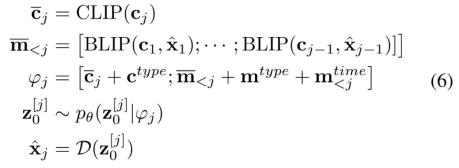现有工作假设每一帧之间的条件独立,并根据字幕生成整个视觉故事。而 AR-LDM 额外地以历史图像为条件来摆脱这个假设,并根据链式法则直接估计后验,其形式如下