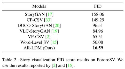 下表 2 展示了在 PororoSV 上的故事可视化结果,其中 AR-LDM 取得了重大进步,SOTA FID 分数得分为 16.59,大大低于以前的方法。