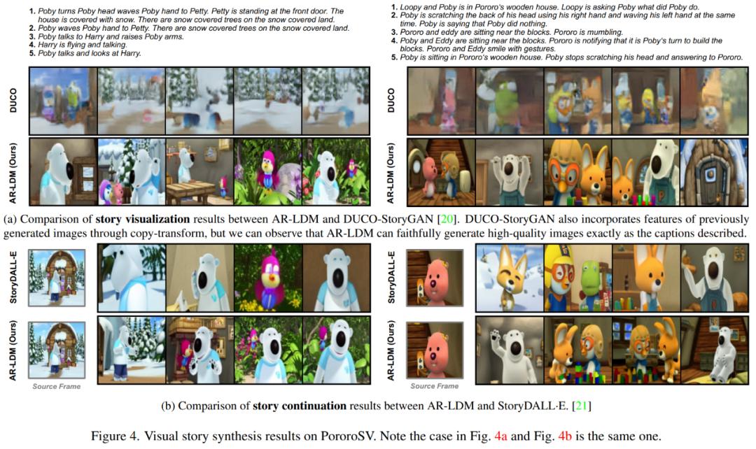 下图 4a 中,AR-LDM 能够生成高质量、连贯的视觉故事,同时忠实地再现角色细节和背景。图 4b 中,AR-LDM 可以通过自回归生成保留场景,例如左侧示例中最后两帧的背景,以及右侧示例中第三和第四帧中的块。