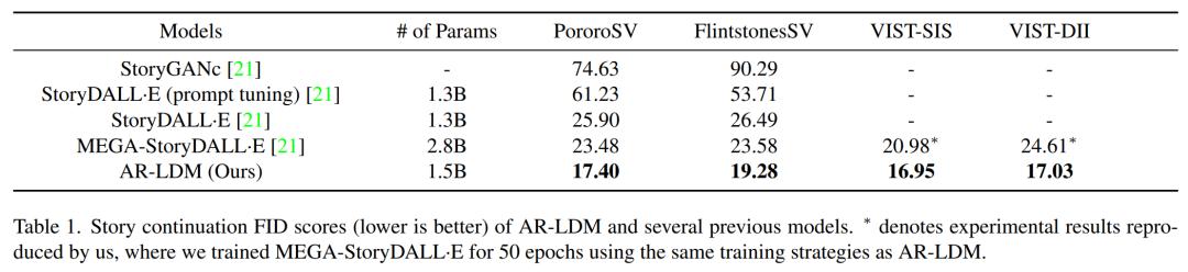 研究者测试了 AR-LDM 的故事连贯性,结果如下表 1 所示。AR-LDM 在所有四个数据集上都获得新的 SOTA FID 分数。值得一提的是,AR-LDM 凭借大约一半的参数优于 MEGA-StoryDALL·E。
