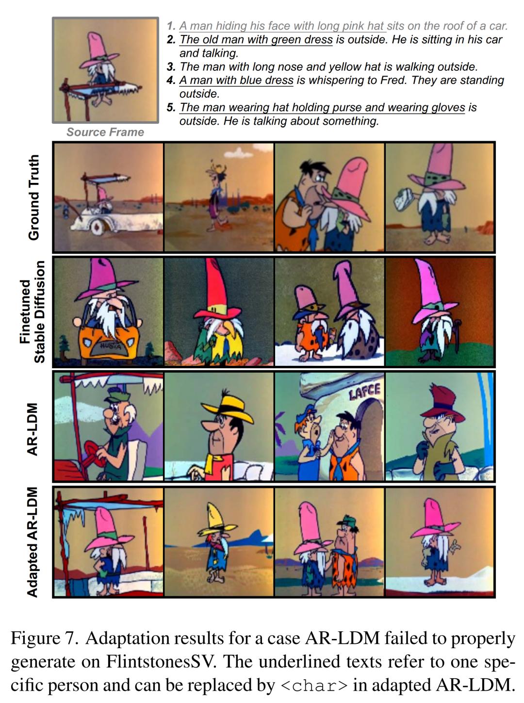 下图 7 中,所有带下划线的文本都指的是同一个角色(即源帧中戴粉色帽子的男人),而描述不一致。因此,AR-LDM 根据每一个描述生成三个不同的角色。在对 3-5 幅图像进行微调后,自适应 AR-LDM 可以生成一致的角色,并如字幕所描述的那样忠实地合成场景和角色。