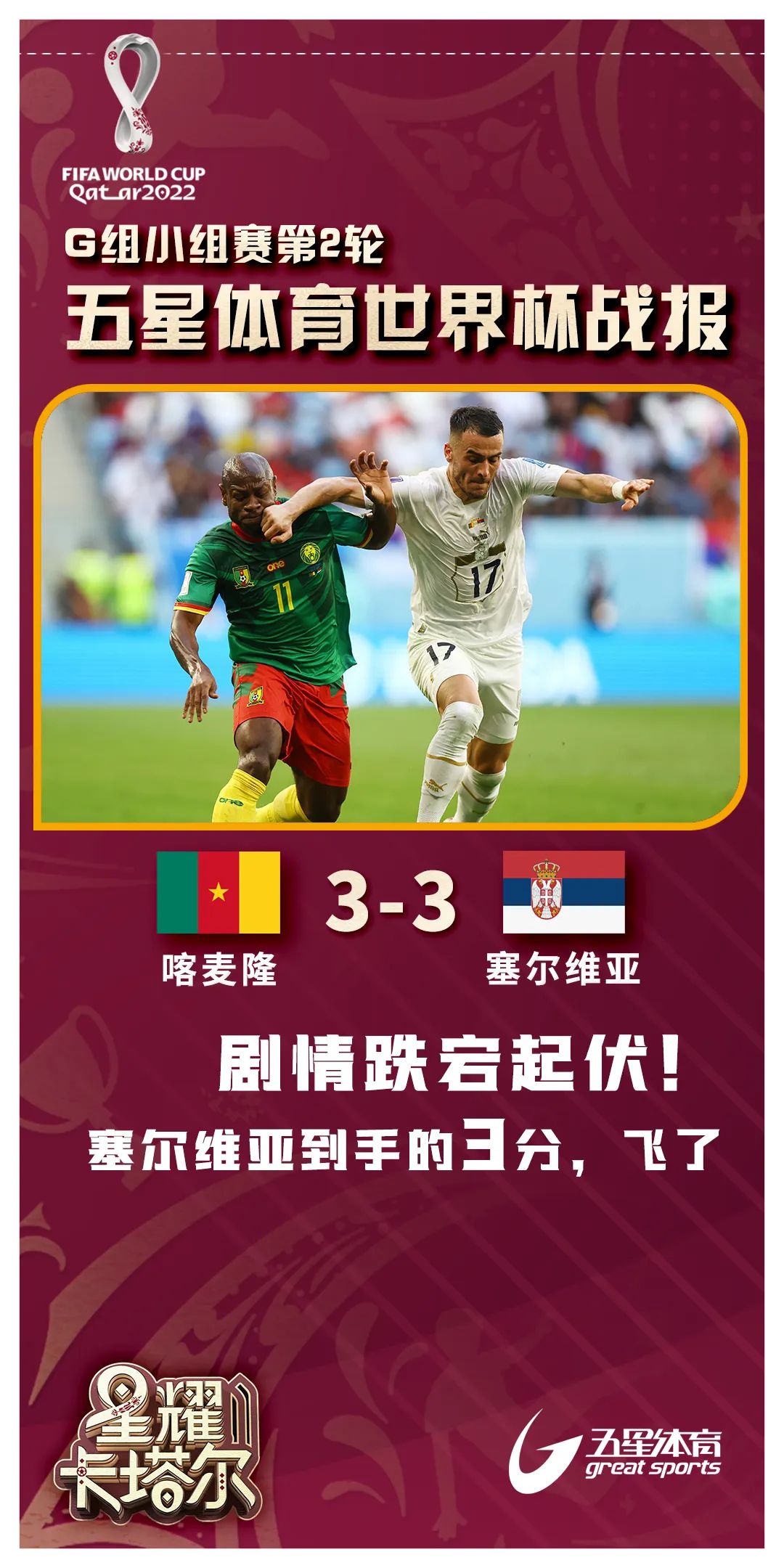 喀麦隆 3-3 塞尔维亚如果说小组赛第一轮属于亚洲球队,那么第二轮似乎是非洲球队的主场。除了加纳3-2战胜韩国,喀麦隆昨夜的表现也堪称神奇。他们在3分钟内从1球领先到1-2落后,见证了塞尔维亚成为有史以来第1支,在世界杯赛场上半场补时阶段中打进1球以上的球队。