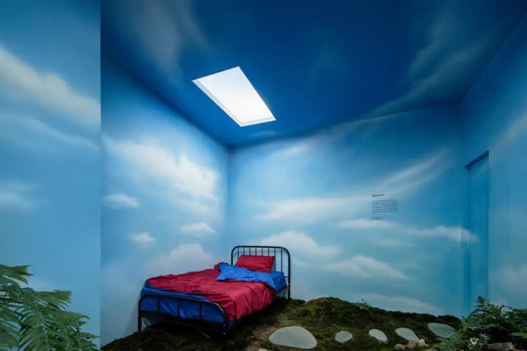 而在由「脏像素 InkyPixel」打造的视觉房间,空间被分为室内和室外两个区域,室内的红布和油画营造了美术馆观展的场景,转身望向另一处,一张床安静地置身于蓝天白云和苔藓草地里;若带着好奇往下探寻,就能找到通向室外的秘密通道。