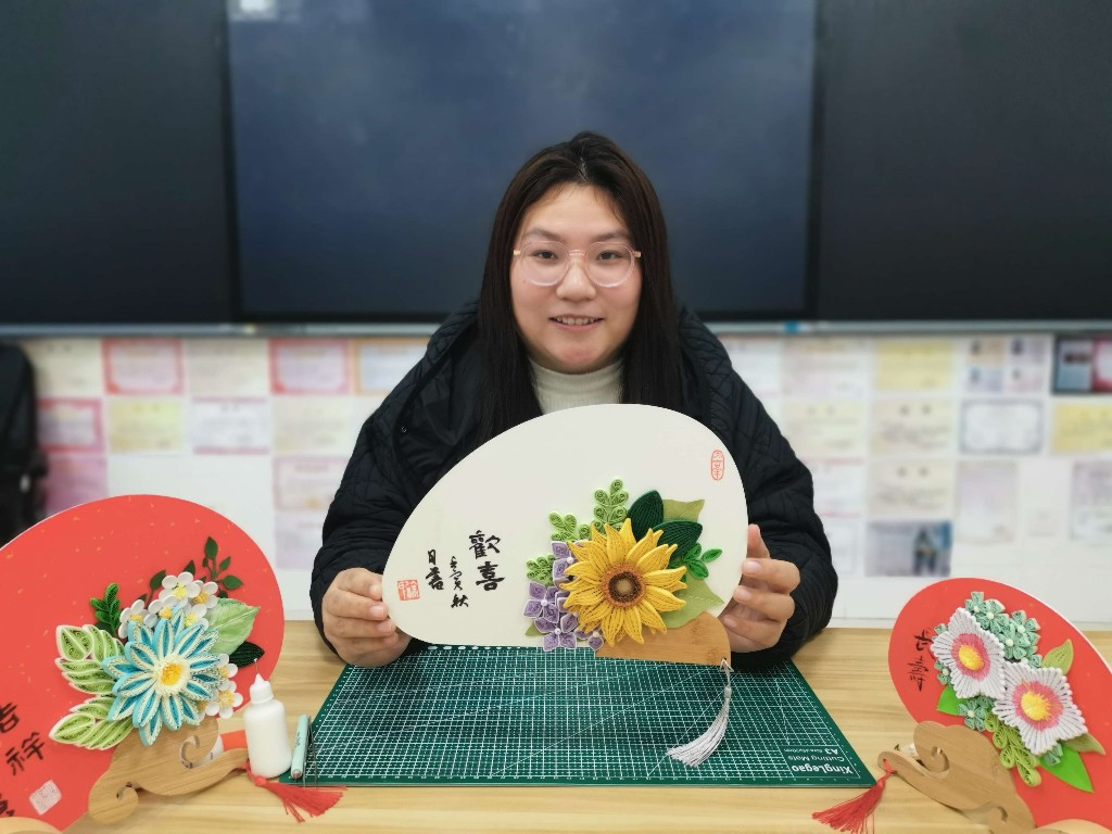 纸条卷一卷,轻松做成花,这种纸上技艺称作衍纸。近年来,随着人们物质文化生活水平的提高,衍纸已成为许多追求生活品质家庭的艺术装饰。宿迁市宿豫区豫新初级中学的美术老师王忆凡是一名衍纸爱好者,她凭借一双巧手,把衍纸艺术和中国传统文化相融合,呈现出美丽的立体“世界”。王忆凡今年35岁,从小就喜欢画画。从事教育工作的父母充分尊重并支持她的爱好,为她报了美术培训班。高考后,她顺利被湖南工业大学包装设计专业录取。大学毕业后,王忆凡成为一名中学美术教师。