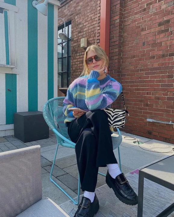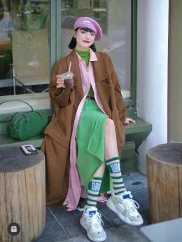 但想要给造型增加一点小心机,跳跃感强烈的彩色袜子也是不错的选择,轻松给人眼前一亮的feel~
