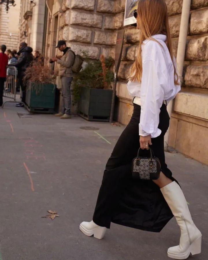 四、穿裙子+长靴,又美又飒今年冬天爆火的长裙,任何一个人还没有的话我都会伤心的好吗!和长靴搭配在一起,两种风格迥异的单品碰撞,还蛮惊艳的!