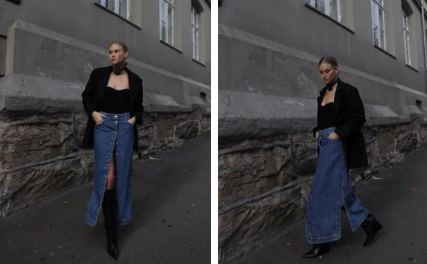 自带率性感的牛仔半裙搭配长靴,比常见的短裙搭配有强调许多,冷酷中带着一点柔美,穿到开春都没有问题!