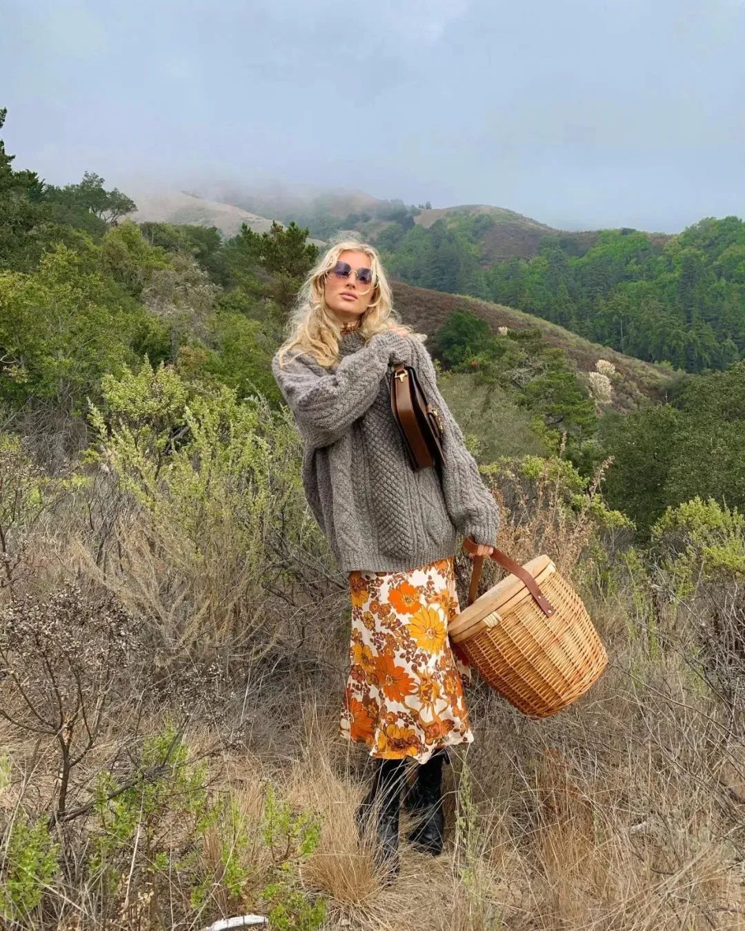 也可以选择和一些带有复古元素的碎花裙搭配,有一种强烈的视觉冲突感,上半身就搭配一件粗棒针毛衣,浪漫的少女感迎风而来。
