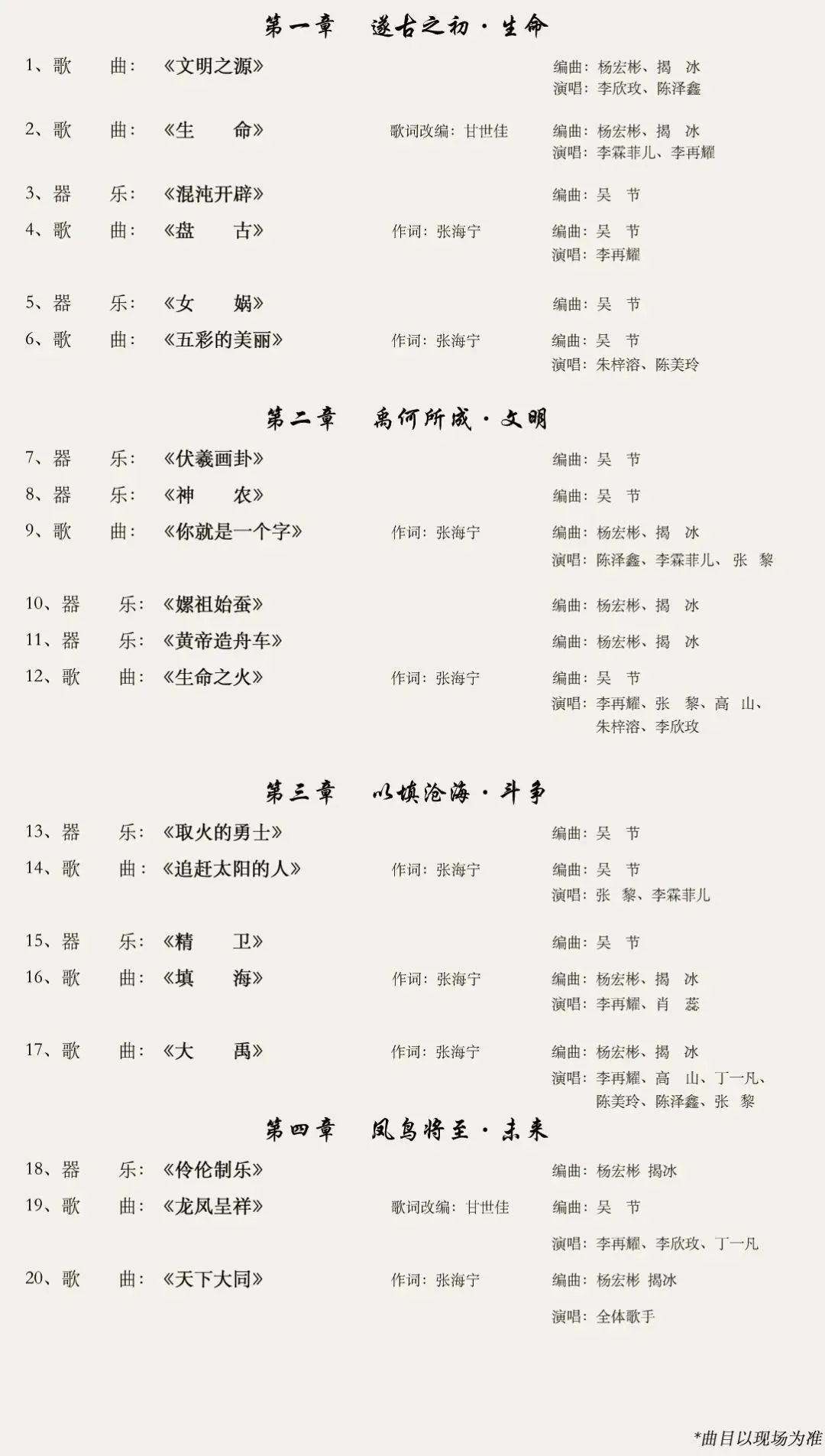 《中华创世神话音乐会》选取了中华创世神话系统中的神话故事,通过《遂古之初·生命》《禹何所成·文明》《以填沧海·斗争》《凤鸟将至·未来》四个篇章,以音乐语汇讲述盘古、女娲、伏羲、神农等神话人物的故事。