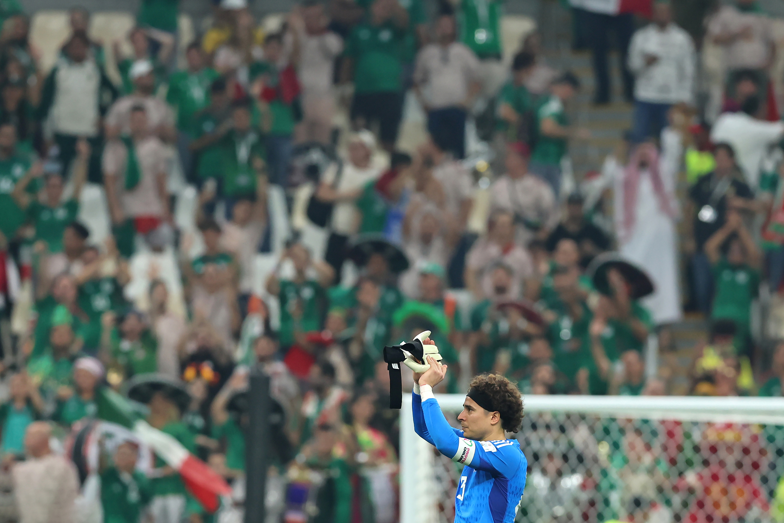 比赛结束后,墨西哥队守卫奥乔高举手套向球迷致谢