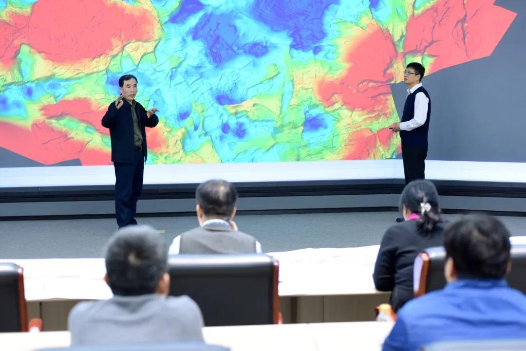 ▲薛永安(左)在会议上为大家介绍勘探情况