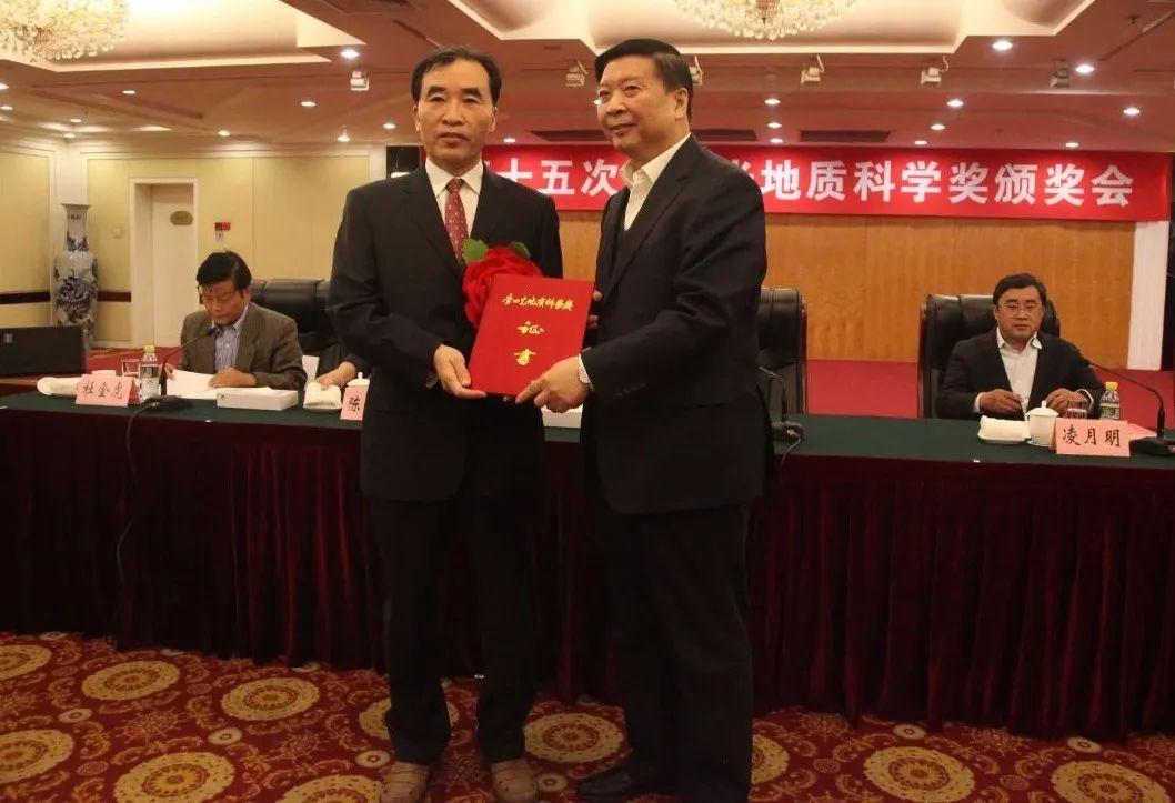 ▲薛永安(左)领取第十五次李四光地质科学奖