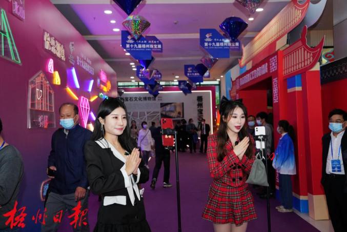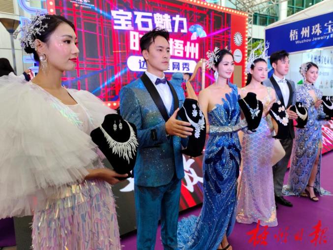 在第十九届梧州宝石节,模特集中展示各色宝石饰品。何鎏 摄双线融合,展会活动精彩纷呈。本届宝石节实现线上线下双向创新,一方面,延续了往届宝石节线上线下展览展销精美的宝石饰品和六堡茶等名特优产品,另一方面,邀请粤剧传承人在宝石节开幕式现场演绎梧州宝石原创歌曲《臻宝赋》,邀请形象正面、带货能力强的网络达人进行现场直播,从不同角度宣传宝石文化,全面展现梧州宝石的特色与魅力,掀起宣传热潮。本届珠宝展专门设置小语种电商直播区,在东南亚最大的在线购物网站Lazada、Shopee、Tiktok等平台开设站点,每天利用泰国语、越南语、马来西亚语、印尼语等进行多场小语种在线直播。借助珠宝展这个展会平台,我市宝玉石产业进一步深化与东盟经贸合作、宝石跨境电商实现提质发展。据了解,珠宝展期间,跨境电商直播观看人数3万人次,成交额100多万元。