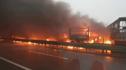 团雾惹祸,43车连撞2020年11月24日,G65包茂高速陕西铜川段关庄立交桥面因团雾发生3起交通事故。现场有43辆车相撞(其中一辆为34吨甲醇槽车),10余辆车着火,造成4人死亡、6人受伤。