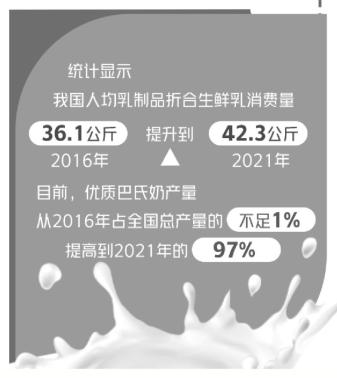 中国农业科学院北京畜牧兽医研究所奶业创新团队研究员郑楠告诉记者,奶业联盟在国际上率先开发制定乳铁蛋白检测方法标准,科学量化了国产与进口乳制品的品质。目前,优质巴氏奶产量从2016年占全国总产量的不足1%提高到2021年的97%。光明乳业、长富乳业、新希望乳业等64家示范企业通过原料奶质量提升、分级利用和绿色低碳加工技术应用,使国产优质巴氏杀菌乳的乳铁蛋白含量从2017年的10.4mg/L,提高到2021年的44.8mg/L,是进口产品的8倍。