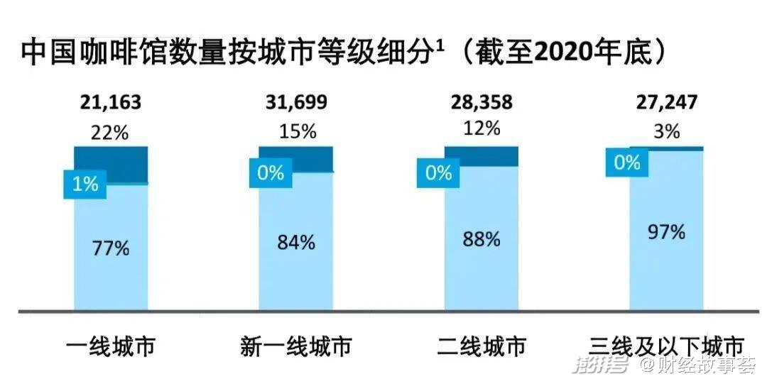《中国现磨咖啡白皮书》显示,截至2020年底时,中国现磨咖啡共有10.8万家的咖啡馆,位于二线及以上城市的咖啡馆数量占75%,在三线以下城市,精品咖啡馆的占比不足1%。