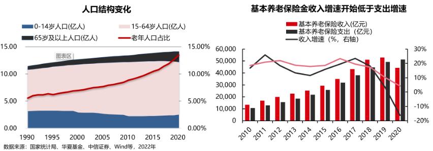 2021年我国老龄化人口占比达到了14.2%,30年前这一数字仅为5.6%。而这标志着我国正式迈入了老龄社会,伴随着平均寿命的不断提升,据OECD预测,中国将于2035年步入超老龄社会,2045年中国65岁以上人口占比将达到25%。在步入超老龄社会的同时,我国养老金结余也极有可能耗尽。根据《中国养老金精算报告2019-2050》,在保留现在财政补贴机制的情况下,2028年养老金当期收支出现缺口,累计结余到2027年将到达顶点,到2035年累计结余耗尽。