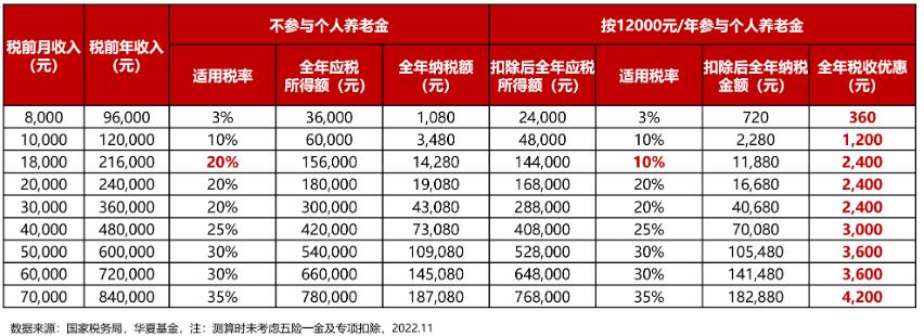 纳税降档的优惠并非所有人都能够享受到,更多的是凭借机缘巧合。以税前月收入18000的刘某为例,全年扣除60000免征额后的应税所得额是156000,适用20%的税率;但如果到手后当年向个人养老金账户转入1.2w,那应税所得额中再扣除1.2w为144000,适用税率为10%,就造成了纳税降档。
