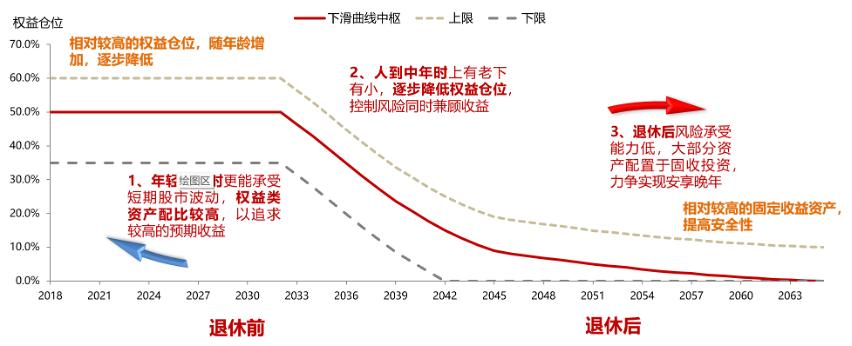为了全面的理解养老业务,华夏基金还通过与全球领先的养老金领域研究专家——富达国际、磐安资产管理、罗素投资、荷兰NNIP等机构进行全方位合作,引入国际先进理论和经验并结合中国的经济增长预期、人口结构、通货膨胀等实际情况进行优化,最终形成了以下滑曲线模型为核心的投资策略,用以辅佐旗下目标日期基金的投资决策。