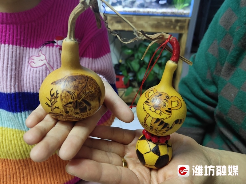 陈召兵为妻子和女儿制作的生肖葫芦烙画。