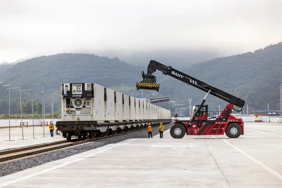 中老铁路首列进口水果直达列车由25个集装箱组成,来自泰国、老挝等地的香蕉、龙眼和榴莲等货源,总重543吨。从老挝万象集结后出发,12月1日穿过中老边境友谊隧道到达磨憨口岸,经过铁路、海关、边检等部门严格查验和检疫程序后,发往昆明。
