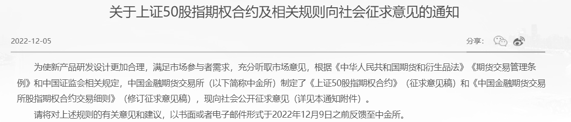 12月5日晚,中金所发布公告表示,为使新产品研发设计更加合理,满足市场参与者需求,充分听取市场意见,根据《中华人民共和国期货和衍生品法》《期货交易管理条例》和中国证监会相关规定,中国金融期货交易所(下称“中金所”)制定了《上证50股指期权合约》(征求意见稿)和《中国金融期货交易所股指期权合约交易细则》(修订征求意见稿),现向社会公开征求意见。