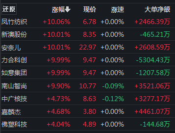 抗病毒面料概念股全天领涨,凤竹纺织、新澳股份、如意集团等多股涨停。