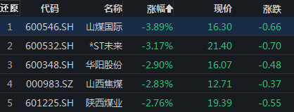 此外,煤炭概念股全天领跌,山煤国际、陕西煤业、华阳股份等跌幅居前,板块内仅两只个股收红盘。