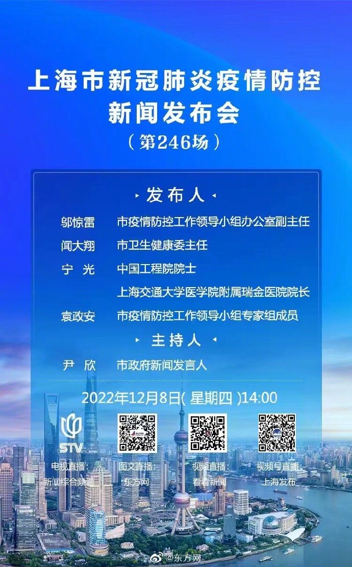 今天(12月8日)14:00,上海将举行新冠肺炎疫情防控工作新闻发布会(第246场),上海市疫情防控工作领导小组办公室副主任邬惊雷,市卫生健康委主任闻大翔,中国工程院院士、上海交通大学医学院附属瑞金医院院长宁光,市疫情防控工作领导小组专家组成员袁政安介绍上海疫情防控最新情况,一起关注!