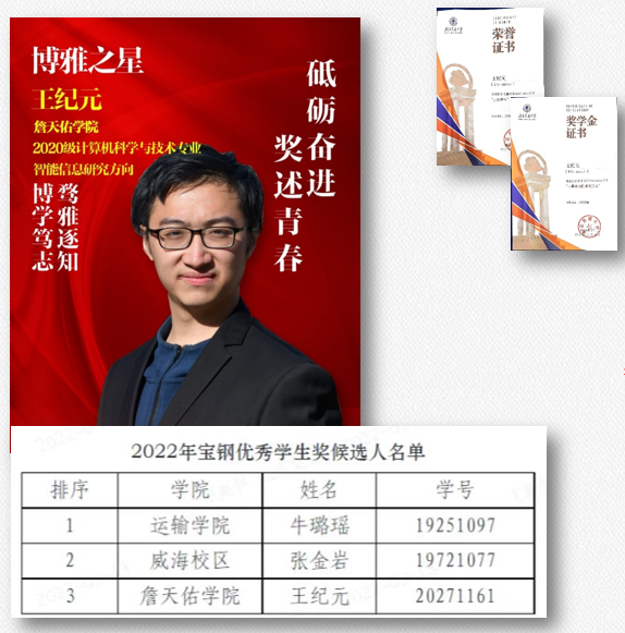 王纪元,中共预备党员,现就读于北京交通大学詹天佑学院计算机与科学技术专业(智能信息研究方向),2020级本科生。曾任校科协宣传部部长,天佑2103,2106班班助,2022北京冬奥会城市志愿者。累计获得知行奖学金、国家奖学金、宝钢奖学金、博雅之星等国家级、省级、校级奖项和荣誉19项。连续两年加权平均成绩和绩点保持詹天佑学院第一。饰主演参与7场《茅以升》话剧河南巡演及校内公演,代表学校到北京科协出演话剧《夙愿》并在其中饰演主角茅以升。