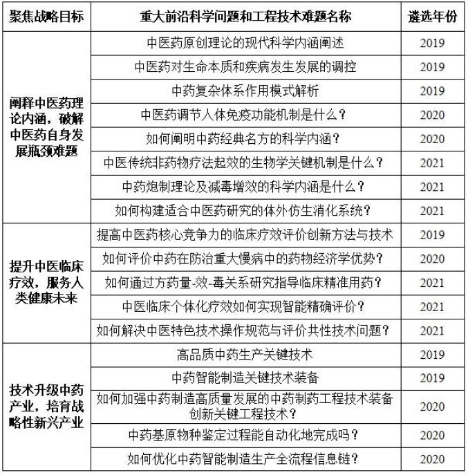 Table 1 Selection Table of "Major scientific and engineering technical problems of TCM" from 2019 to 2021