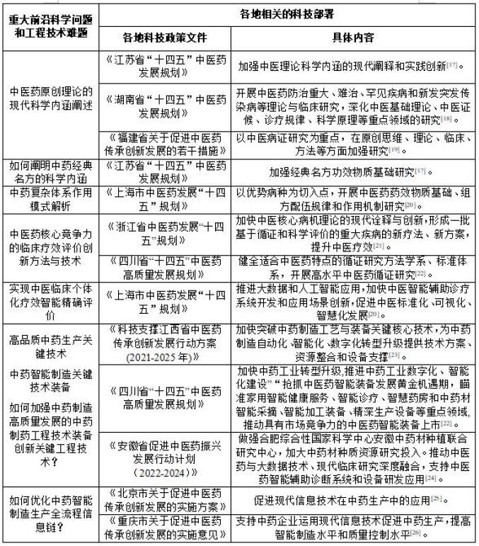 各地方积极贯彻落实中央精神,立足自身资源优势,加快建设中医药发展高地,纷纷颁布了相关支持政策,明确了发展中医药举措,其中“中医药原创理论的现代科学内涵阐述、中药复杂体系作用模式解析、如何阐明中药经典名方的科学内涵、中药复杂体系作用模式解析、提高中医药核心竞争力的临床疗效评价创新方法与技术、中医临床个体化疗效如何实现智能精确评价、高品质中药生产关键技术、中药智能制造关键技术装备、如何加强中药制造高质量发展的中药制药工程技术装备创新关键工程技术、如何优化中药智能制造生产全流程信息链?”等10个重大问题与省市科技规划内容密切相关,见表2。