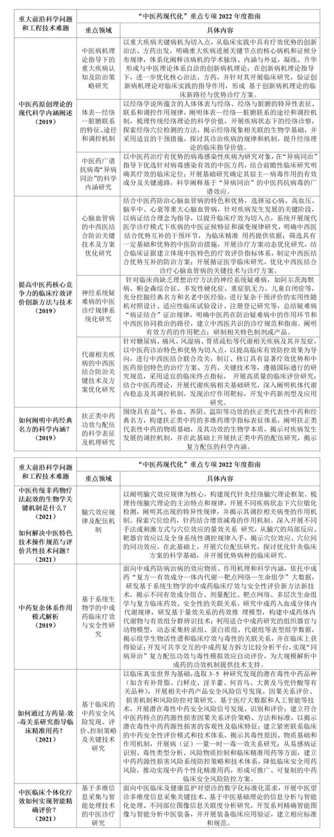Table 4 Application of "major scientific problems and engineering technical problems of TCM" in the 2022 annual application guideline of National Key R&D Program of Modernization of TCM from 2019 to 2021