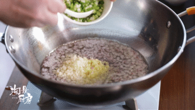 加入0.5碗(125ml)油、2调羹(30g)洋葱末、1调羹(15g)姜末、3调羹(45g)蒜末、1调羹(15g)葱白,小火炸至金黄并出香味。